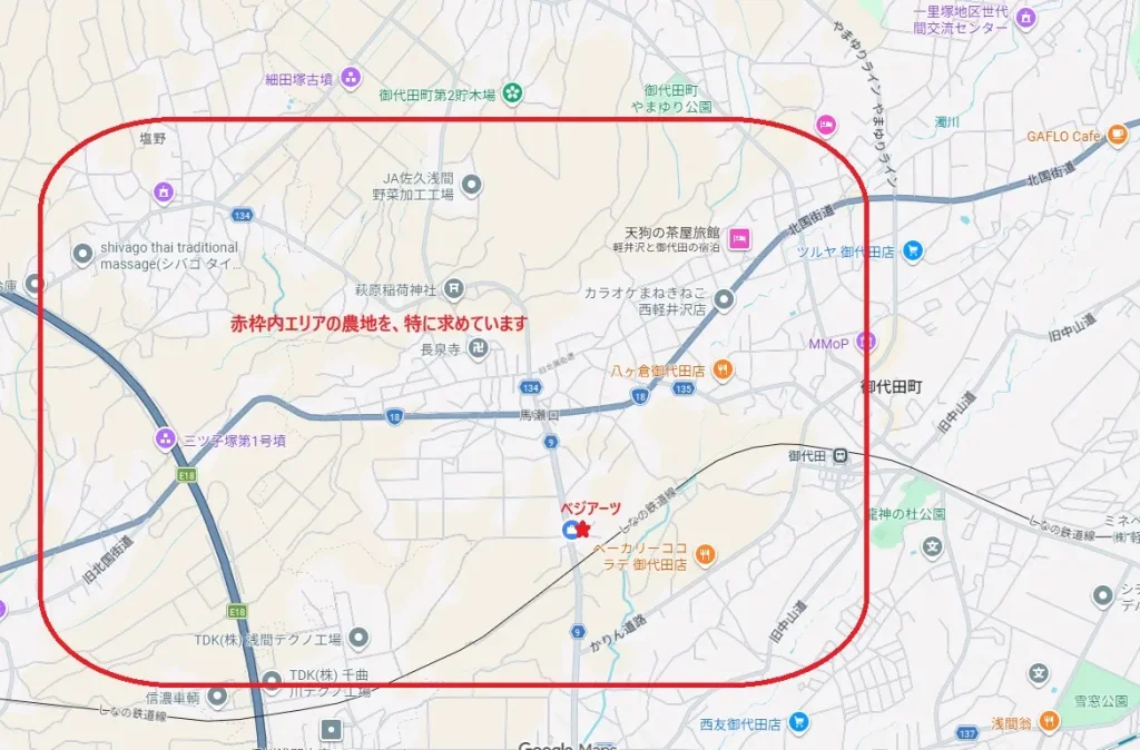 現在は特に赤枠内のエリアを中心に、新しい農地を探しております。